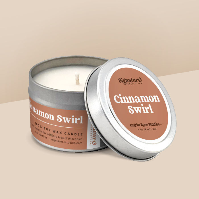 Cinnamon Swirl soy candle in a 4 oz travel tin, from the Signature Collection by Angela Rose Studios.