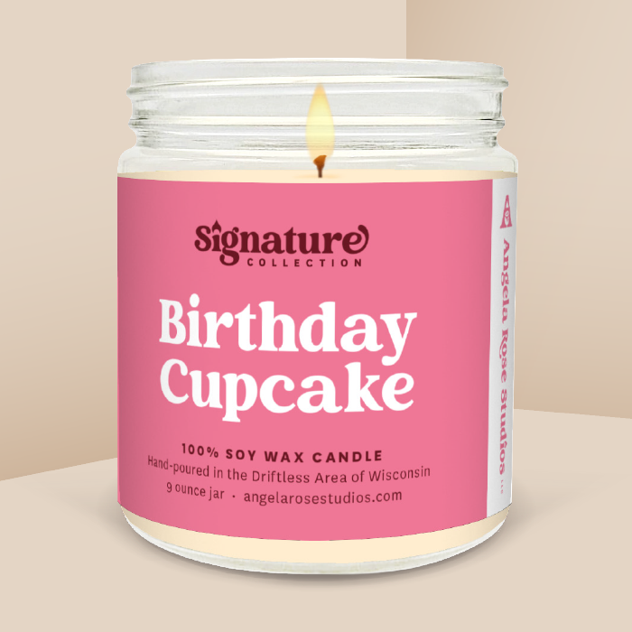 Birthday Cupcake soy candle in a 9 oz glass jar, from the Signature Collection by Angela Rose Studios.